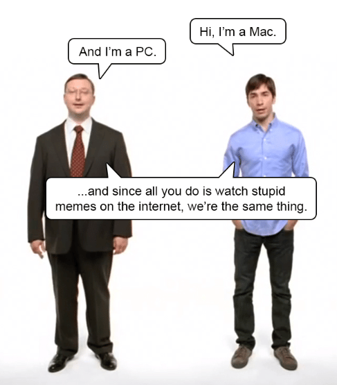 For a powerful example of this look no further than Apple’s iconic "I'm a Mac, I'm a PC" campaign. It's an in-group favouritism, cognitive consistency, competitor laddering, layer cake of awesome. Yum 😋